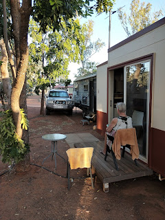 After our initial concerns about being quarantined in Tennant Creek we have settled into the restricted lifestyle and feel fortunate that we are able to open windows for fresh air (even though no fly screens) and have access to an outside deck and limited surrounds.  Another couple from Darwin came in after our arrival - they also crossed the NT/Qld border -  unfortunately no combined Happy Hours allowed. Amazing how the days go by and I am able to get the Blog up to date, while Helen has a healthy supply of books to read.  The highlight of the day is when we have visitors checking our welfare and checking we have not absconded during the night, housekeeping staff to restock supplies (although they cannot come into the cabin) and the Cafe owners delivering our meals!  Must say that all these people have been extremely friendly and happy to have a bit of a chat.  The meals supplied by Top of the Town Cafe have been great and plentiful - good we have double doors to get out of after our 14 days of eating!  Huge thanks to Nicole and Lincon for top quality food and beverages.